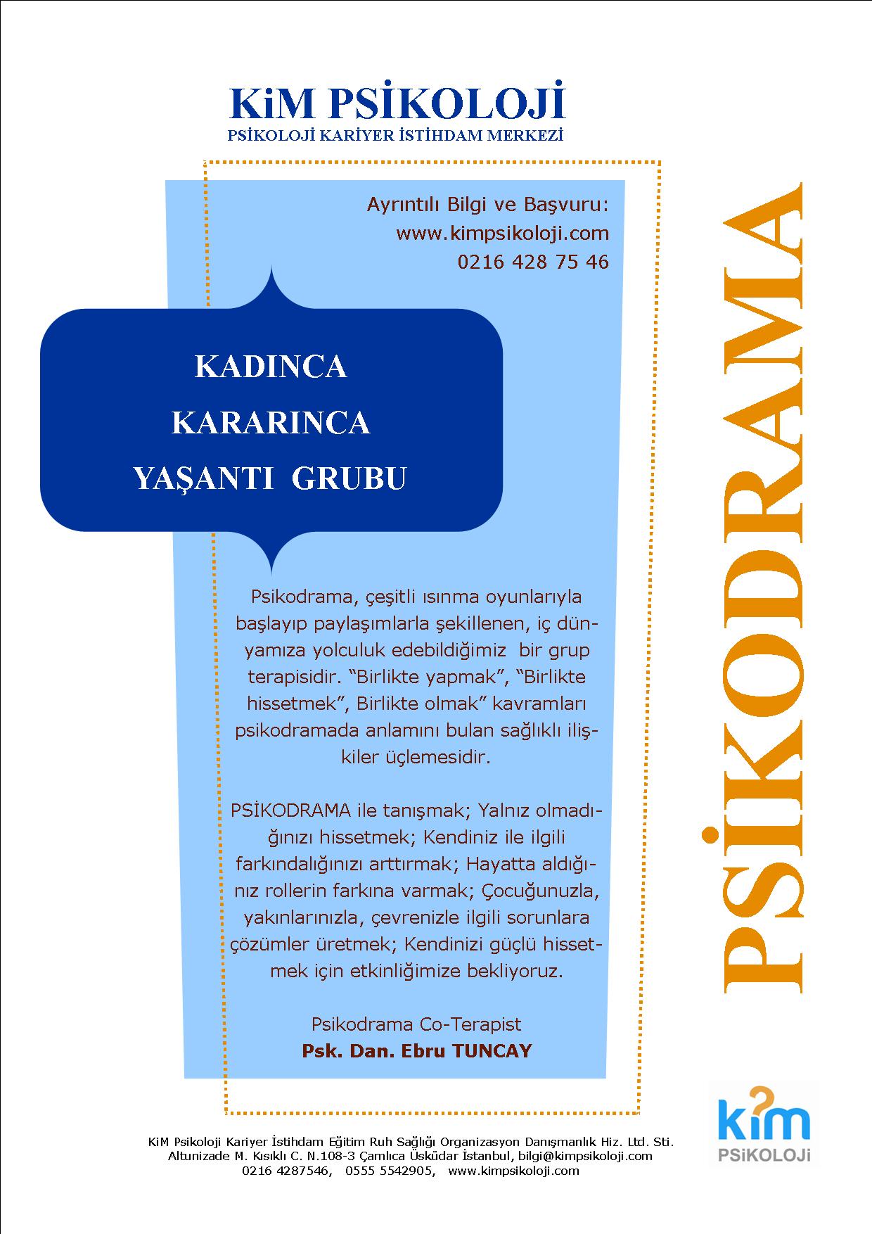 Psikodrama ve Sanatla Terapi teknikleri ile kadınlara yönelik psikolojik destek verilmesi, KADININ kendini tanıması, şimdiyi yaşarken geçmişin izlerinden geleceğe güvenle bakabilmesi, çözüm üretebilmesi, yaratıcılığını ve spontanlığını ortaya koyabilmesi, bu özelliklerini güçlendirebilmesi, iç görü ve farkındalığın kazanılabilmesi, empati (diğerini yaşama) yeteneğinin geliştirilmesi çalışmaları, grup yaşantısının amacını oluşturmaktadır.