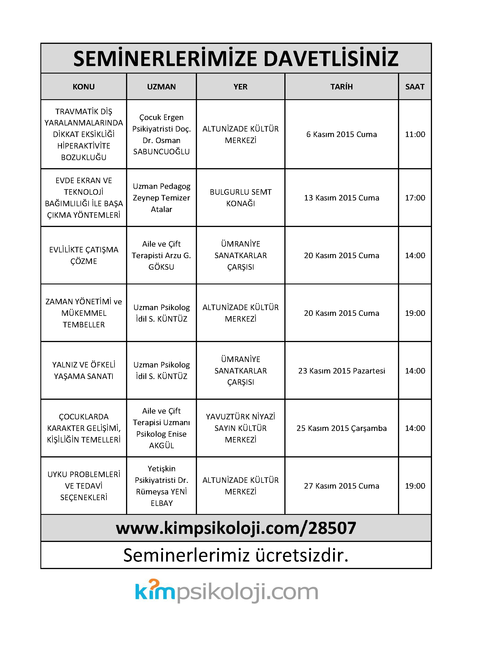 kimpsikoloji.com ücretsiz seminerler kasım 2015